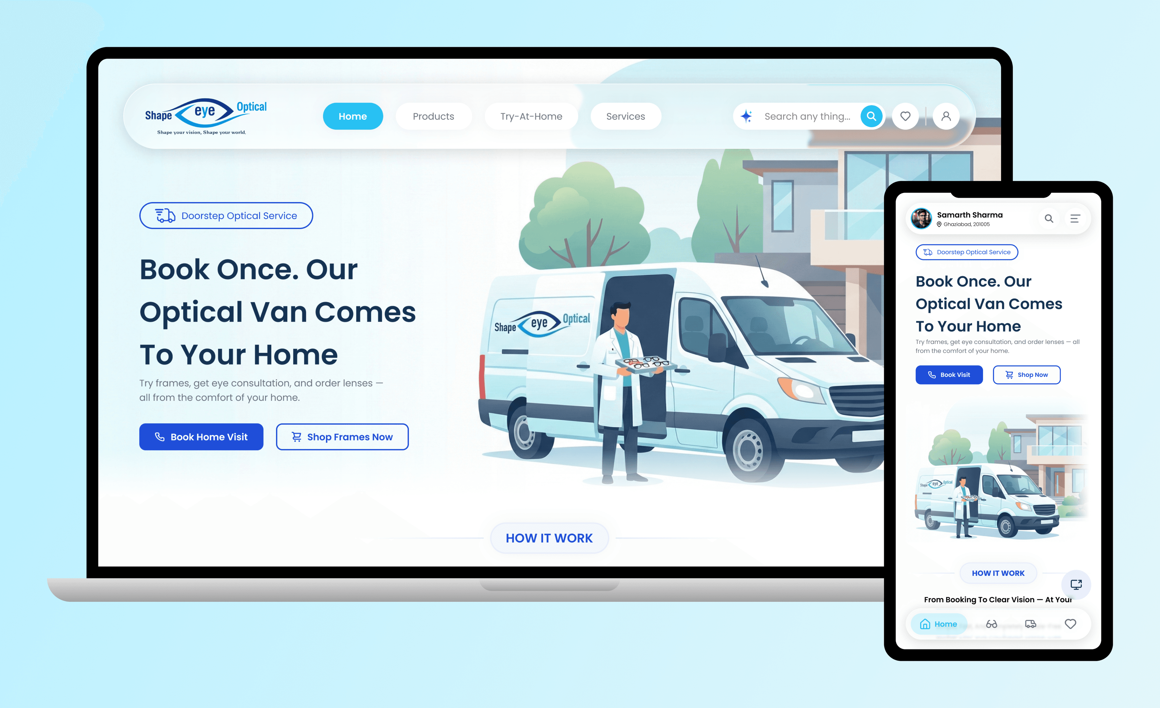Shape Eye Optical is a doorstep optical service platform that brings eye testing, frame selection, and glasses delivery directly to users’ homes.